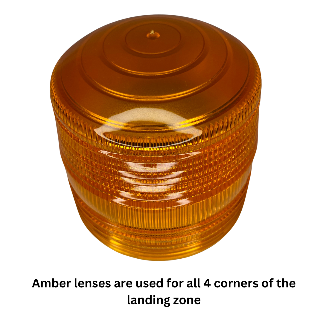 Shock and weather resistant amber domes are used to demarcate the four corners of the Life Flight™ Landing Zone. Amber has been scientifically proven to provide maximum visibility and attract maximum attention.