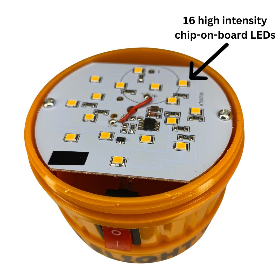 There are 16 state-of-the-art high intensity board-mounted (COB) chip on board LEDs per light module that can be seen over 5000 ft away - board-mounted LEDs are superior to the old style LEDs- they produce more light, less heat, last for thousands of hours of runtime, and can handle a lot more abuse and rough handling.
